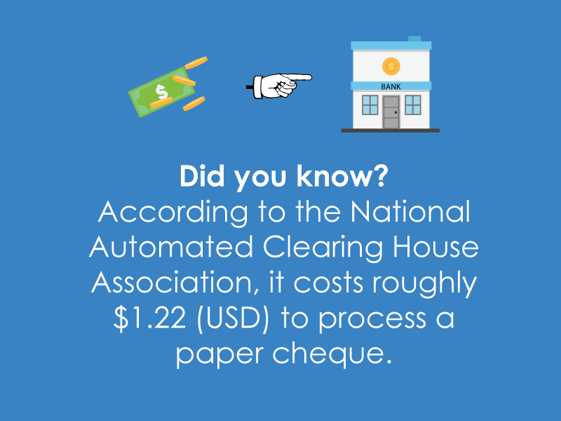 Time is money, and the time it takes to process a cheque does end up costing you. In fact, according to the National Automated Clearing House Association, it costs roughly $1.22 (USD) to process a paper cheque. Paper cheques may cost a business up to $24,540 annually when employee labor, materials, bank fees and postage are factored into the equation.